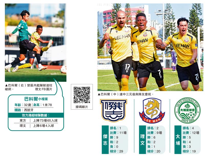 港超聯17日上演兩場左右榜首3雄爭標形勢的大戰,由賽前次席的大埔在主場大埔運動場迎戰第3位的理文,結果理文憑藉前鋒巴科爾個人連中三元,最終以5:3擊敗下半場尾段以十人應戰的大埔。理文全取3分後在積分榜上以1分反壓對手,升上第二位。至於緊接上演的榜首隊傑志,則作客以3:0大勝流浪,取得聯賽6連勝。賽後,傑志29分穩守榜首,理文以20分反壓大埔升上第2,落敗的大埔則跌至第4。\大公報記者 張銳(文﹑圖)