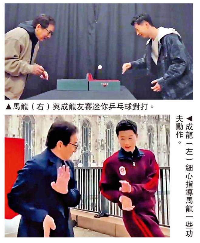 【大公報訊】1月16日,在意大利米蘭舉行的李寧品牌時裝周活動中,37歲的國家乒乓球名將馬龍與72歲的功夫巨星成龍驚喜同框,兩人不僅互贈簽名禮物、即興切磋迷你乒乓球,而成龍更指導馬龍簡單的功夫動作。由於二人名字中都有一個「龍」字,這次結緣被網民稱為「雙龍會」,引爆全網熱議。