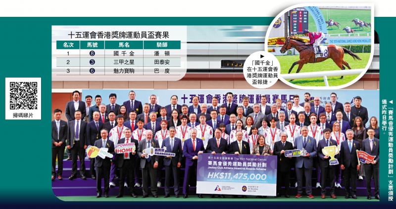 香港賽馬會(「馬會」)18日於沙田馬場舉行「十五運會香港獎牌運動員賽馬日」,表揚中國香港代表團在首次由粵港澳三地共同承辦的第15屆全國運動會中,勇奪9金2銀8銅,創下香港代表團於全運會的歷史最佳成績。賽馬日同場進行「賽馬會優秀運動員獎勵計劃」支票頒贈儀式,向獎牌健兒發放獎金共11,475,000港元。\大公報記者 張銳