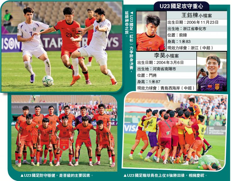 中國男子U23足球隊將在20日晚上11時30分舉行的U23亞洲盃4強賽中與越南隊爭奪決賽席位。U23國足門將李昊在8強賽多次神勇救球,成為球隊取勝晉級的最大功臣。這位「小門神」有望憑着在西甲球會馬德里體育會的留洋經歷,力爭幫助國家隊再次歷史性突破成績,躋身決賽。(HOY TV 77台晚上11時25分直播)\大公報記者 朱家立