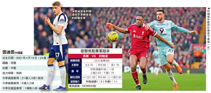 利物浦一直在尋找34歲荷蘭中堅華基爾雲迪積克的接班人,他們自去季起便將目標鎖定英格蘭中堅馬克古希,甚至一度開價獲水晶宮接受,未料在最後一刻交易被取消。當冬季轉會窗重開後,古希卻加盟曼城,令利物浦大失預算。可幸最新消息指出,利物浦已經另覓目標,就是效力熱刺、24歲的荷蘭中堅雲迪雲。後者2023年由禾夫斯堡轉會熱刺,已經累積3季英超比賽經驗。這位速度奇高的中堅亦能勝任左閘位置,但由於今季在熱刺表現不俗,預計利物浦必須為他付上昂貴轉會費才有機會收歸麾下。