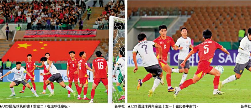 左圖﹕U23國足球員彭嘯(前左二)在進球後慶祝。\新華社﹔右圖﹕U23國足球員向余望(左一)在比賽中射門。\新華社