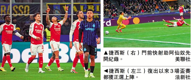 【大公報訊】阿仙奴前鋒加比爾捷西斯迎來傷癒復出後最「夢幻」的一仗,這名前曼城射手昨晨歐聯作客意甲榜首國際米蘭一戰正選「梅開二度」,協助球隊在聖西路以3:1告捷,再創隊史於歐聯7連勝的紀錄之餘,亦篤定會排首兩名之內,直接晉身16強淘汰賽。