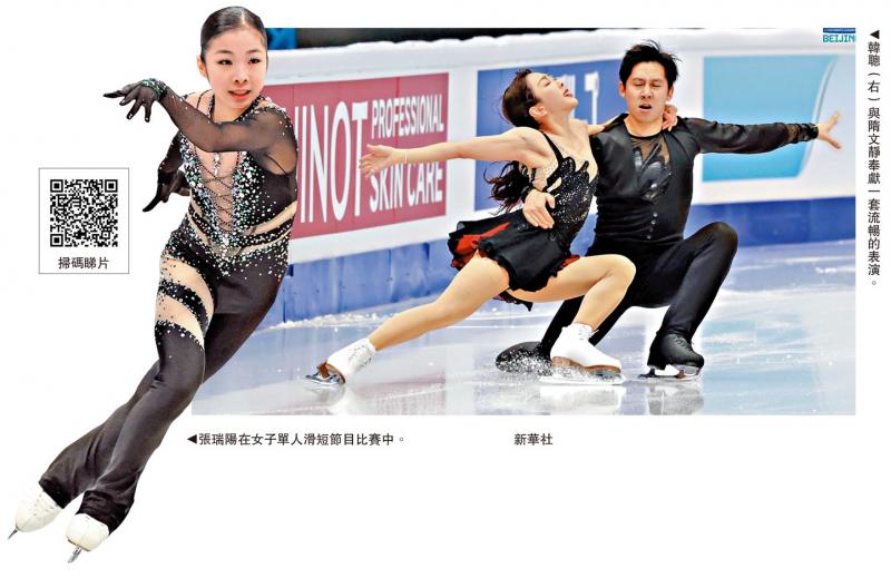 1月22日,2026年國際滑聯四大洲花樣滑冰錦標賽在北京國家體育館開幕,首日進行了女子單人滑短節目、冰舞韻律舞、雙人滑短節目三個項目。中國花滑選手悉數登場,展現拚搏姿態。女子單人滑短節目比賽中,中國選手張瑞陽獲得58.81分暫列第十一位。冰舞韻律舞項目中,中國組合王詩玥/柳鑫宇在冰舞韻律舞比賽中得到64.41分暫列第八。賽事焦點的雙人滑名將「葱桶組合」隋文靜/韓聰奉獻一套流暢、完整的表演,以76.02分刷新本賽季國際比賽最好成績。\大公報記者 蘇雨潤北京報道