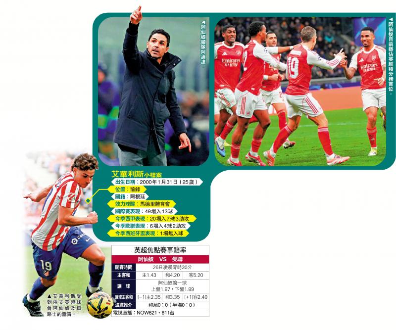阿根廷新星祖利安艾華利斯自2024年加盟馬德里體育會後表現出色,不過馬體會卻無力爭冠,因此這名「獎盃殺手」有意離隊,雖然他首選加盟巴塞隆拿,但對方未必有足夠資金簽下他,故此他下一個目的地可能回到英超。目前艾華利斯的經理人正與「倫敦雙雄」阿仙奴及車路士會面,不過艾華利斯與馬體會的合約要到2030年6月才約滿,兩隊若要搶走這名前曼城射手,將要支付逾億英鎊轉會費。\大公報記者 梁潤森