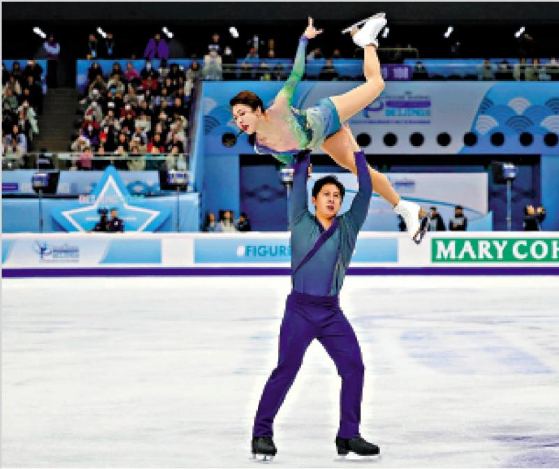圖﹕隋文靜(上)與韓聰在雙人滑自由滑項目獲得銀牌。\大公報記者蘇雨潤攝