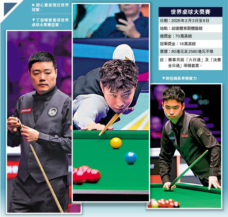 「世界桌球大獎賽2026」將於2月3日至8日在啟德體育園體藝館上演,這是大獎賽連續兩年在香港舉行。總結去年經驗,主辦單位在本屆加強表演賽的吸引力及重要性,同時亦有其他新嘗試,使大賽變得像舉辦為期一周的運動嘉年華一樣。說回賽事,這是世界桌球巡迴賽(WST)的排名賽,僅世界排名前三十二位選手獲參加資格,分量十足。以世界冠軍趙心童為首的10名中國好手,將對陣英國等名將,力爭在賽事冠軍獎盃刻下首位來自中國球手的名字。\大公報記者 梁潤森