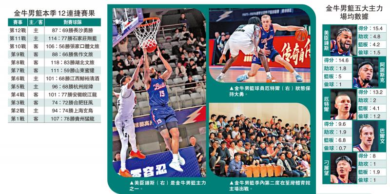 全國男子籃球聯賽(NBL)27日晚上8時在荃灣體育館上演,香港金牛籃球隊將在主場對陣貴州猛龍。金牛上仗在啟德體藝館對陣長沙勇勝,雖然前者一度落後,但最終以87:69反勝,延續開季12戰全勝佳績。金牛主教練解立彬坦言球隊上仗手風欠順,尤其是三分球命中率低於預期。作為NBL總冠軍兩連霸球隊,預計金牛今仗只要三分球投射回復正常水準,便可取得開季13連捷紀錄。(港台電視32今晚7時54分直播)\大公報記者 朱家立