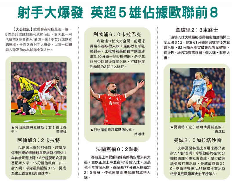 【大公報訊】歐聯聯賽階段最後一輪,5支英超球隊都順利取勝而回,更因此一同佔據前8位置直入16強。這5支英超球隊能夠達標,全靠各自射手大爆發,以每一個關鍵入球及助攻為球隊全取3分。