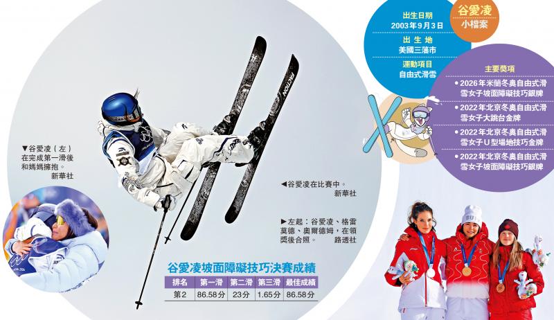 米兰冬奥会9日晚在利维尼奥雪上公园举行自由式滑雪女子坡面障碍技巧项目决赛,上届北京冬奥银牌得主、中国名将谷爱凌向金牌发起冲击。谷爱凌在首轮取得86.58分一度在所有运动员中领先,但争取卫冕冠军的瑞士选手格雷莫德于第2滑以86.96分后来居上,随着谷爱凌在最后一滑出现失误,最终她覆製上届成绩,收获本届冬奥中国体育代表团首枚银牌的同时,个人冬奥生涯亦增至2金2银。\大公报记者 梁润森