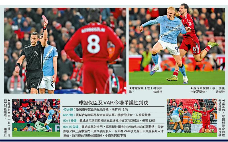 9日凌晨英超「褪色巔峰戰」重要性雖減退但話題性卻「爆燈」,主場的利物浦憑蘇保斯拉爾射出「天外飛仙」自由球而領先,但曼城卻連下兩城最終反勝2:1,不過最「搶鏡」還是球證保臣及VAR球證布魯克斯,整場比賽作出了多個極具爭議性的裁決,當中最令球迷側目就是補時臨完結前,將曼城一記「得益入球」改判無效,並向首先犯規的蘇保斯拉爾出示紅牌,導致兩隊同樣感到不滿,球迷亦大惑不解,只能說保臣雖依照球例但就矯枉過正。\大公報記者 譚德龍
