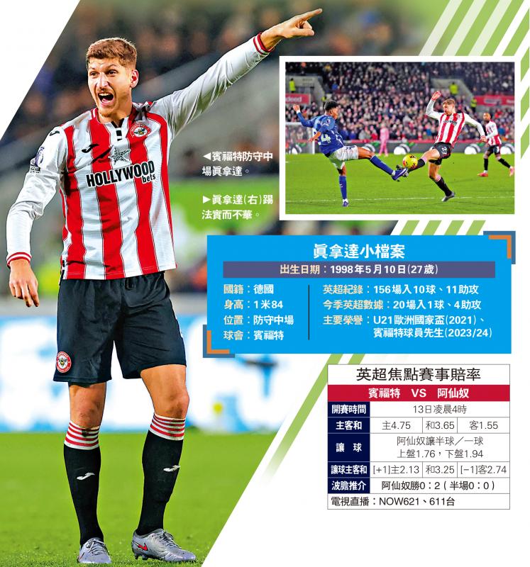賓福特在明晨英超準備在主場當阿仙奴爭標的「攔路虎」,真拿達將繼續夥拍軒達臣做好防務第一關,再依靠丹高奧達拉為殺手泰亞高製造機會。真拿達亦有機會與同樣傷癒復出後有好表現的德國同胞夏維斯交鋒,而客軍射手基奧基尼斯在新一年所有賽事已入6球,為全英超之最,而球隊近3仗已回復不失球,今戰可能又出現「悶贏」情況,「讓球」阿仙奴讓半/一,應取上盤。(NOW621及611台明晨4時直播)