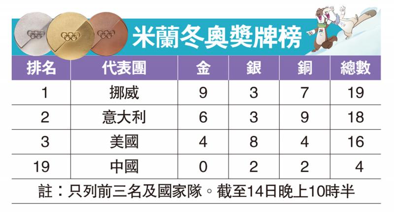 米蘭冬奧獎牌榜