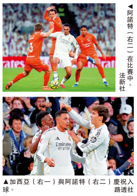 【大公報訊】記者譚德龍報道:皇家馬德里於15日凌晨西甲主場以4:1大破皇家蘇斯達,豪取聯賽8連勝後,趁巴塞隆拿17日凌晨才有比賽而暫時壓過對方升上榜首;傷癒復出後近2個半月來首次正選的右閘阿歷山大阿諾特表現不俗,並為先開紀錄的入球送出助攻,獲皇馬主帥艾比路亞大讚「好彩有他」。