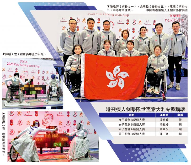 2026殘疾人劍擊世界盃意大利站19日至22日在比薩舉行,中國香港代表隊派出7名運動員參賽,包括女子花劍A級「世一」余翠怡,以及在重劍B級、花劍B級皆位列世界排名前三的湯雅婷。經過激烈角逐,最終湯雅婷為港隊收穫重劍B級個人賽銀牌及花劍B級個人賽銅牌。余翠怡及另一港隊代表陳㬢則分別在不設季軍戰下獲得女子花劍A級個人賽及男子花劍B級個人賽並列銅牌,港隊遂以1銀3銅收官。\大公報記者 朱家立