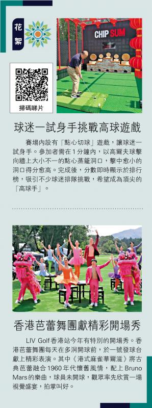 LIV Golf香港站今年有特別的開場秀。香港芭蕾舞團每天在多洞開球前,於一號發球台獻上精彩表演。其中《港式麻雀華爾滋》將古典芭蕾融合1960年代懷舊風情,配上Bruno Mars的樂曲,球員未開球,觀眾率先欣賞一場視覺盛宴,拍掌叫好。