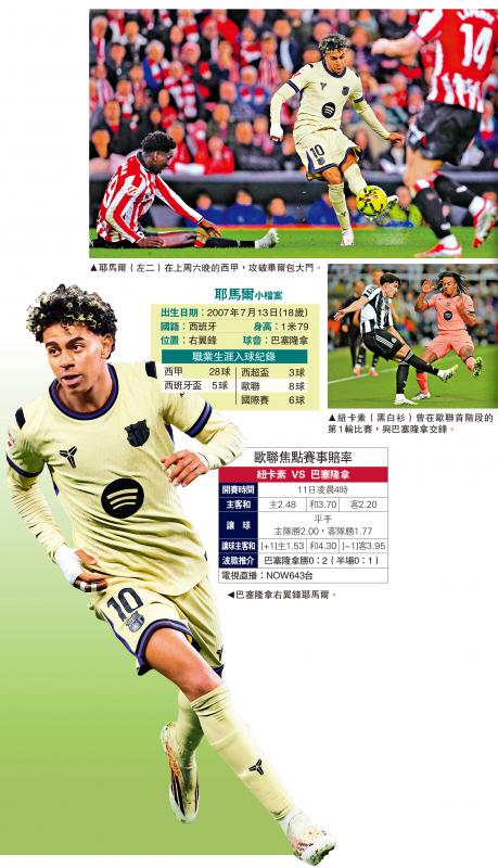 當然,耶馬爾要實踐「球王夢」目前言之尚早,面前的關口就是香港時間11日凌晨的歐聯16強首回合作客再逢英超紐卡素,而耶馬爾亦準備又創歐聯正賽上陣30場的最年輕球員紀錄。兩隊已曾在首階段的第1輪交鋒,當時巴塞在耶馬爾因傷缺陣下,靠拉舒福特「梅開二度」而以2:1獲勝,但後者今戰將退居後備,由拉芬夏比洛尼復任正選,而紐卡素仍有中場主力般奴古馬雷斯倦勤,經常在領先下被對手追平甚至反勝亦顯示欠穩定的問題,恐怕再次難敵高一班以上的巴塞,「讓球」盤口開出平手盤,客隊巴塞去馬。(NOW643台11日凌晨4時直播)
