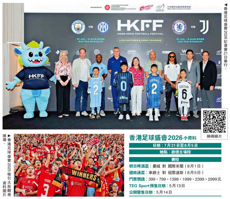 21日,全球賽事製作及推廣公司TEG Sport召開記者會,宣布香港足球盛會將於暑期回歸。4支來自英格蘭及意大利的頂級球會──曼城、國際米蘭、車路士及祖雲達斯──將於8月1日及5日在啟德主場館上演兩場熱身賽,8月1日為曼城對國際米蘭,8月5日則為車路士迎戰祖雲達斯,門票為399元至2999元不等。預料屆時將吸引大批球迷入場觀賽,勢必令啟德主場館高朋滿座,鞏固香港在國際大型體育盛事的地位。\大公報記者 張銳