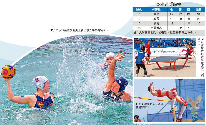 沙灘田徑在2014年首次成為亞沙運正式項目,本屆賽事新增了女子跳高。作為傳統項目的龍舟,本屆亞沙運首次設置100米直道賽。新增項目的精彩呈現,也為亞沙運後續擴容創造了有利條件。