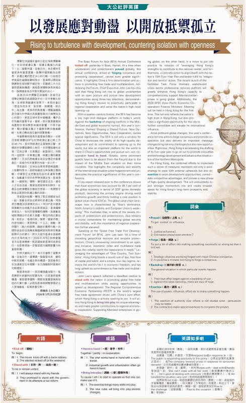 The Boao Forum for Asia (BFA) Annual Conference kicked off yesterday in Boao, Hainan. At a time when unilateralism and protectionism prevail globally, this annual conference, aimed at "forging consensus and promoting cooperation", carries even greater significance. It highlights China's firm determination and actions in promoting free trade and multilateralism. Addressing the Forum, Chief Executive John Lee Ka-chiu said that Hong Kong will rise to global uncertainties with an open posture and pursue new development opportunities along three key directions, demonstrating Hong Kong's resolve to proactively participate in regional cooperation and serve the nation's high-level opening-up.