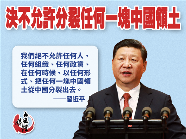 「我們絕不允許任何人、任何組織、任何政黨、在任何時候、以任何形式、把任何一塊中國領土從中國分裂出去,誰都不要指望我們會吞下損害我國主權、安全、發展利益的苦果。」