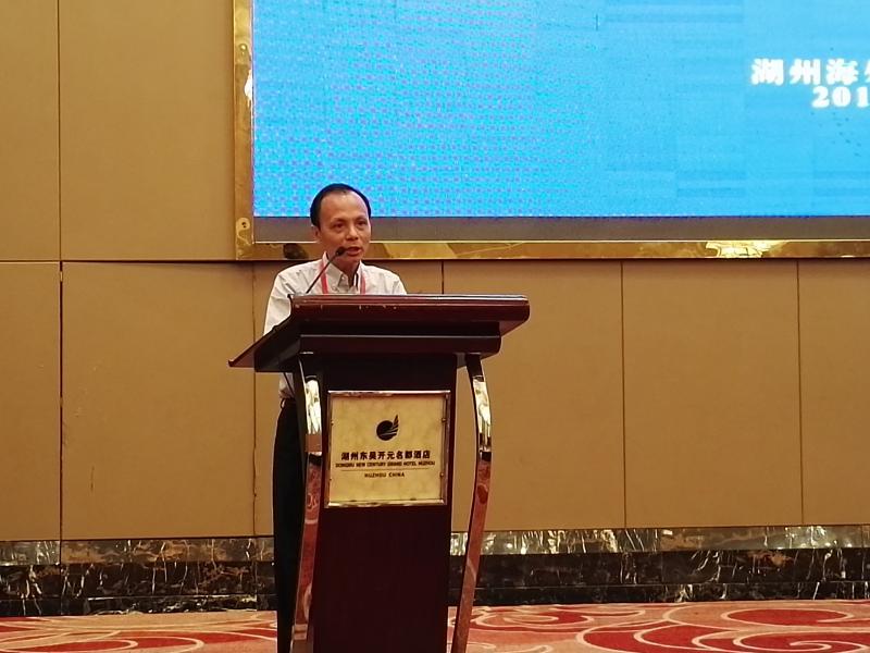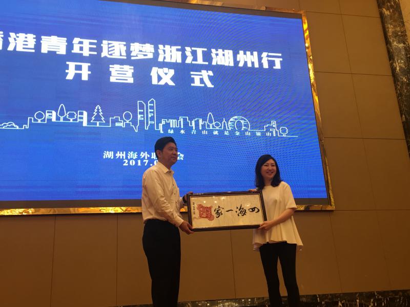 湖州市委常委、統戰部長崔鳳軍與香港浙江省同鄉會聯合會青委會主席王淑慈互贈此次活動紀念品