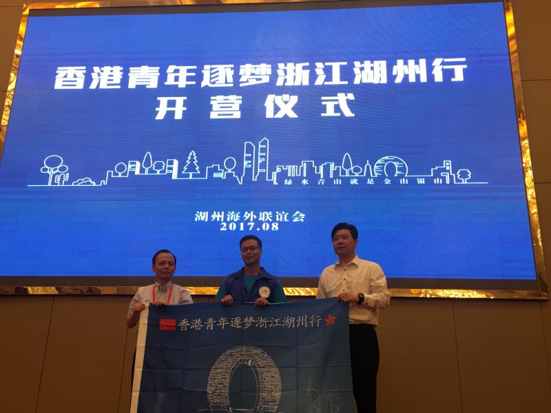 湖州市委常委、統戰部長崔鳳軍、香港中聯辦社會工作部副部長梁建向湖州行團組授旗