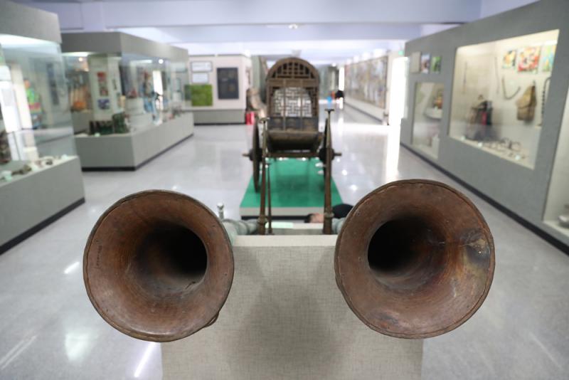 圖:成吉思汗召內陳列的巨大法號/大公報記者盧冶攝