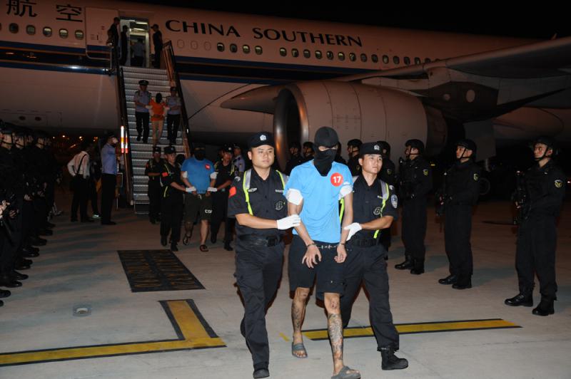 圖:8月3日晚,部分跨國電信網絡詐騙案嫌疑人被押解回天津/新華社