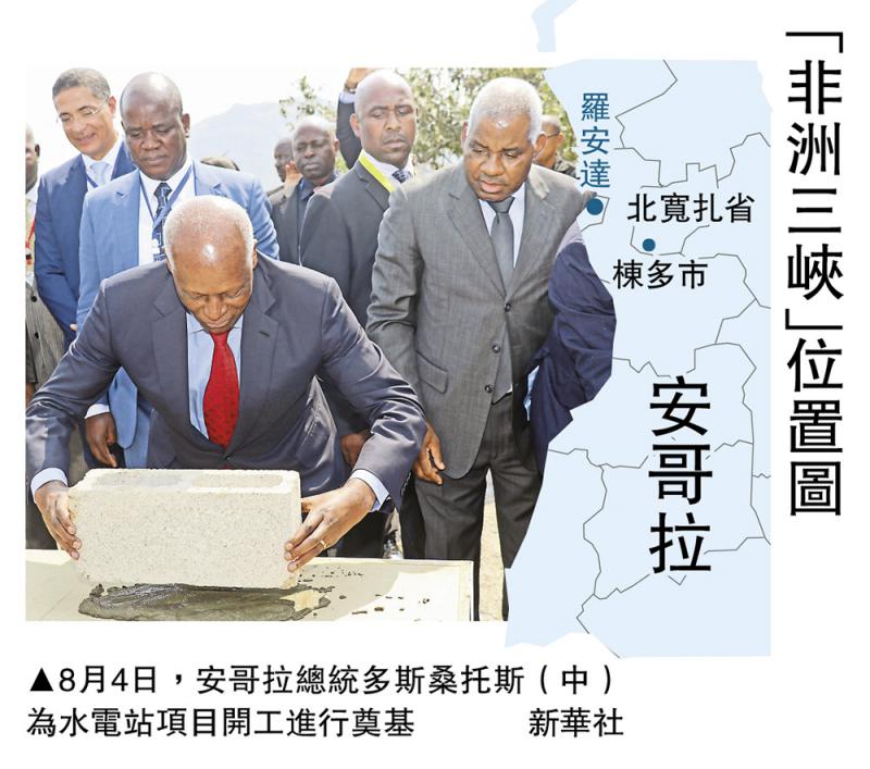 圖:8月4日,安哥拉總統多斯桑托斯(中)為水電站項目開工進行奠基/新華社