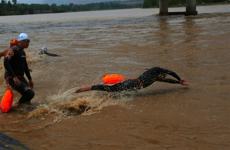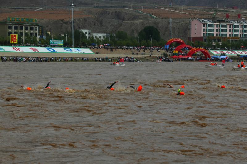 泳將們魚貫而入黃河。(特派記者唐瑜 攝