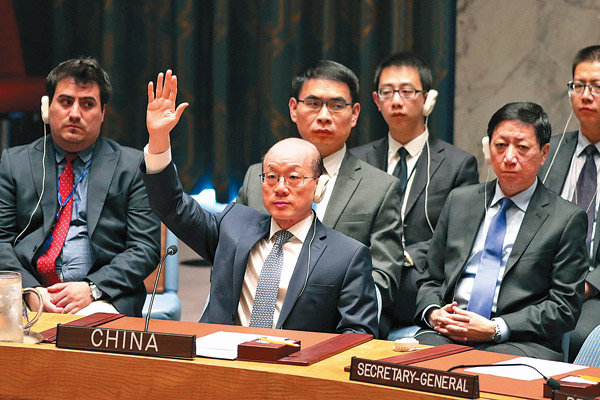 圖:當地時間8月5日,聯合國安理會在紐約聯合國總部通過針對朝鮮實施新制裁的決議。中國常駐聯合國代表劉結一在表決該項決議時舉手表示贊成/美聯社
