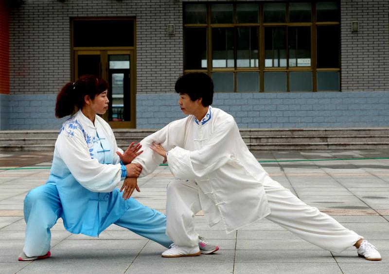 崆峒(國際)武術節比賽場外,太極推手對練。肖剛 攝