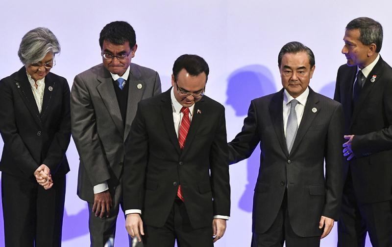 圖:8月7日,在菲律賓馬尼拉,中國外交部長王毅(右二)與韓國外長康京和(左一)、日本外相河野太郎(左二)、菲律賓外交部長卡耶塔諾(中)以及新加坡外長維文(右一)共同出席東盟與中日韓(10+3)外長會前的合影環節 路透社