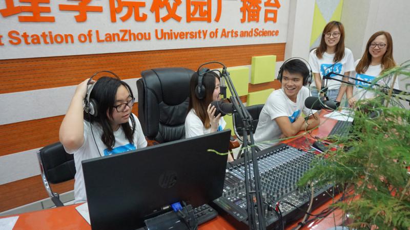 圖:香港學子們參觀蘭州文理學院的校內廣播電台,並一嘗當DJ的滋味 大公報記者曾慶業攝