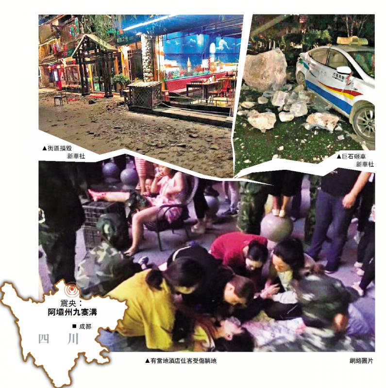 四川省阿壩州九寨溝縣境內8日晚間21時19分發生黎克特制7.0級大地震,據九寨溝縣應急辦電話報告統計,地震目前已造成5人死亡(死者均為遊客),63人受傷、逾百人受困景區。國家減災中心公布的地震快速評估指出,這次地震可能造成2.4萬間房屋倒塌或嚴重損毀,或有數十至上百人死亡,上千人受傷。國家主席習近平對四川九寨溝7.0級地震作出重要指示,要求迅速組織力量救災,全力以赴搶救傷員,最大限度減少人員傷亡。國務院總理李克強對四川九寨溝7.0級地震作批示,要求國家減災委、國務院救災指揮部即派聯合工作組趕赴災區,指導幫助地方做好抗震救災。/大公報記者向芸成都報道