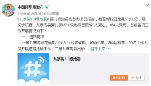 大公網8月9日訊 綜合新華社、人民網、中新網報道,8月8日21時19分,四川省阿壩州九寨溝縣(北緯33.2度,東經103.82度)發生7.0級地震,震源深度20公里。截至8月9日凌晨5時00分,經初步核查,九寨溝縣漳扎鎮M7.0級地震已造成9人死亡、164人受傷。