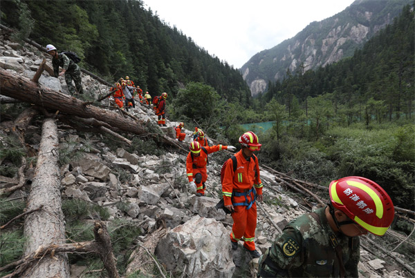 中國國際救援隊對九寨溝山體滑坡險段進行重點排查(中新社)
