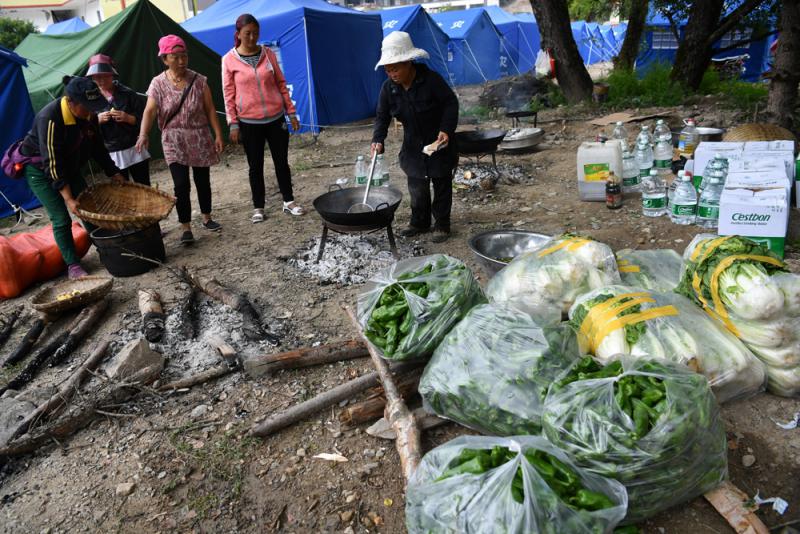 圖:12日,新鮮蔬菜從外地不斷運入臨時安置點/中新社