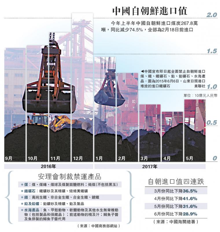 去年3月和11月,聯合國兩次通過決議實施對朝鮮銅、鎳、銀、鋅礦、煤炭等出口限制。為執行聯合國安理會決議,去年12月,中國商務部、海關總署聯合發布消息,暫停進口朝鮮原產煤炭到年底。今年2月,中國商務部、海關總署又發布公告,決定從2月19日起本年度暫停進口朝鮮原產煤炭。
