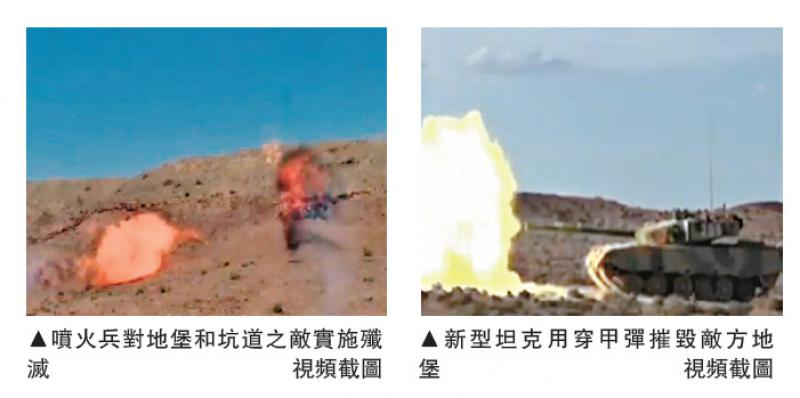 演練中,某新型坦克率先衝出,利用自身強大的火力突擊能力對敵地堡群展開猛烈打擊。 隨後跟進的步戰車依託有利地形,運用炮射導彈和火炮對敵地堡進行再次打擊。 與此同時,車載步兵迅速下車,利用反坦克火箭對殘餘地堡進行打擊,噴火兵對地堡和坑道之敵實施殲滅,爆破手抵進至地堡群側翼,對堅固地堡進行爆破毀傷。