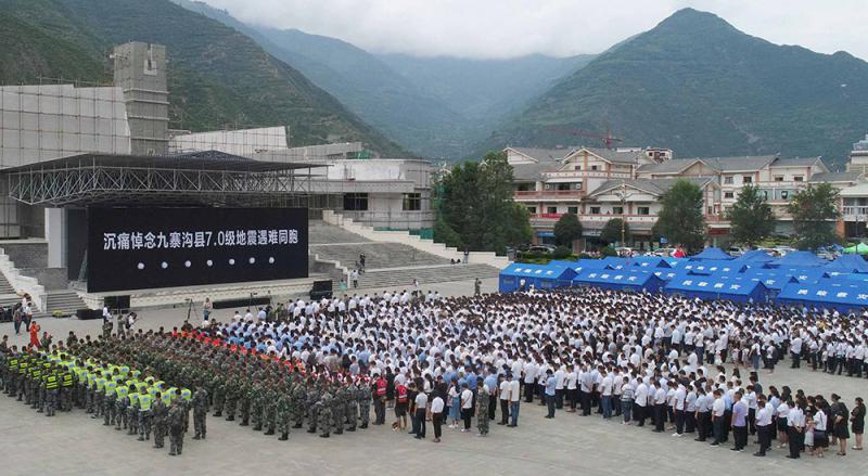 圖:15日,九寨溝縣城舉行公祭活動,沉痛悼念九寨溝縣7.0級地震遇難同胞 新華社