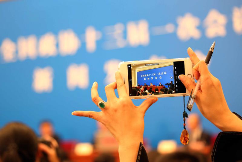 ▲不少全媒體記者在新聞發布會現場直播發稿