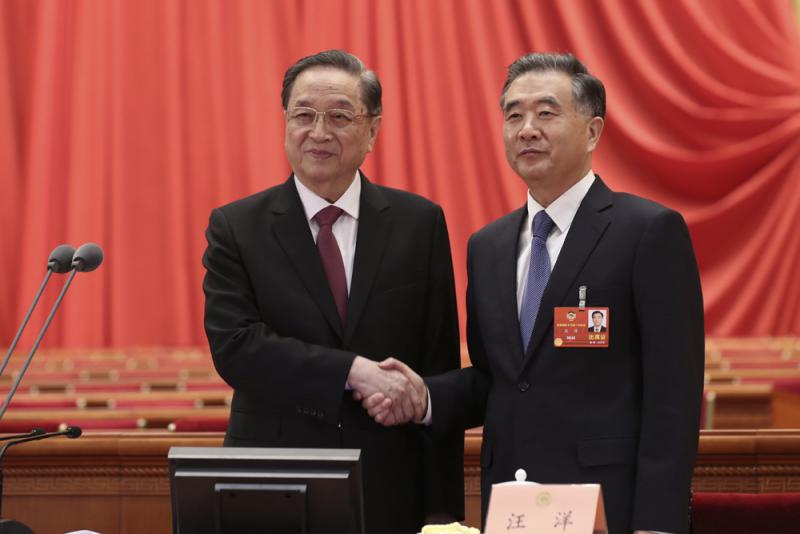 圖:3月2日下午,全國政協十三屆一次會議預備會議在北京人民大會堂舉行。會議由十二屆全國政協主席俞正聲主持,汪洋任全國政協十三屆一次會議主席團會議主持人。圖為俞正聲、汪洋握手 中新社