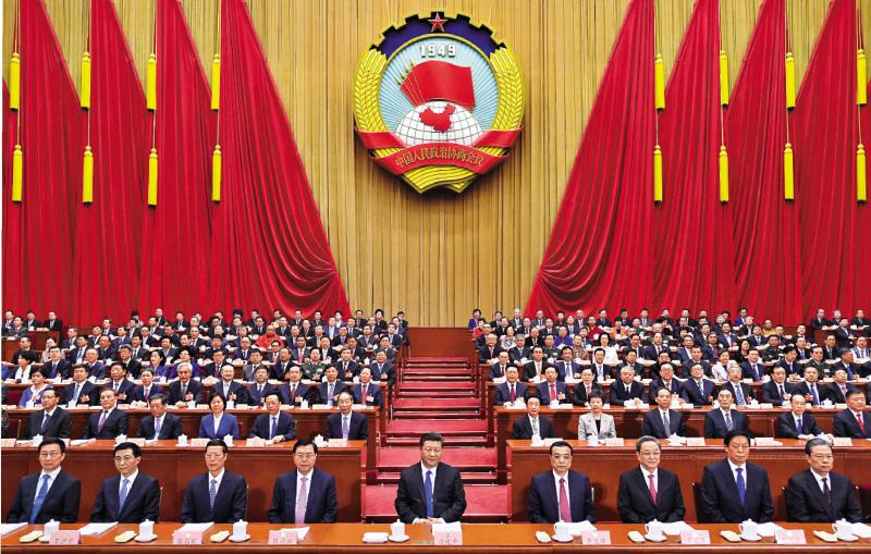 圖:3月3日,全國政協十三屆一次會議在北京人民大會堂開幕。這是習近平、李克強、張德江、俞正聲、張高麗、栗戰書、王滬寧、趙樂際、韓正在主席台就座 新華社