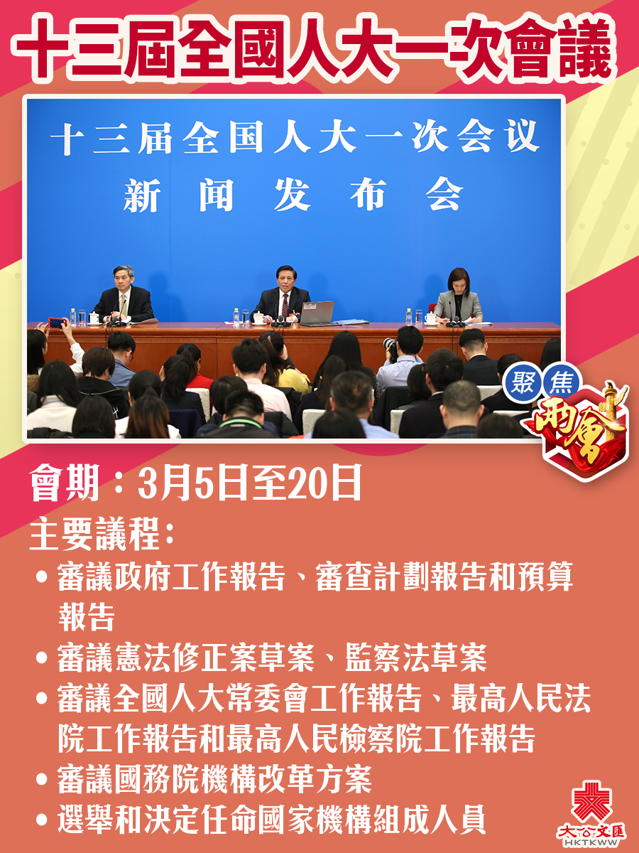 大公文匯全媒體報道:十三屆全國人大一次會議新聞發布會今日(4日)舉行。十三屆全國人大一次會議副秘書長、發言人張業遂表示,十三屆全國人大一次會議將於明日(5日)開幕,20日閉幕,會期共15天半。一圖看完大會10項主要議程。