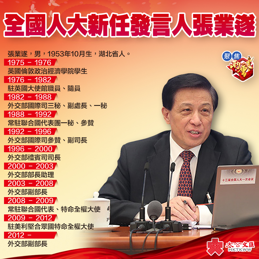 大公文匯全媒體報道:十三屆全國人大一次會議於3月4日上午11時舉行首場新聞發布會。大會新任發言人張業遂就大會議程和人大工作相關的問題回答中外記者提問。張業遂生於1953年10月,現任外交部副部長,負責常務工作及主管涉港澳台外交事務。他曾擔任香港回歸儀式的中方司儀、常駐聯合國代表、駐美大使,有40餘年外交工作經驗。張業遂為全國人大設立發言人以來的第八位發言人。