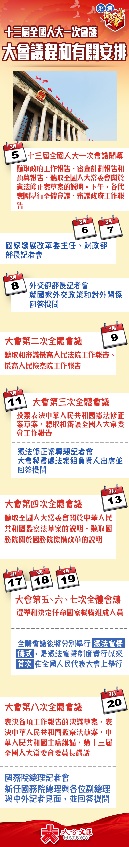 大公文匯全媒體報道:十三屆全國人大一次會議將於5日開幕,20日閉幕。大會共有10項議程,8次全體會議及14次記者會。一圖看清大會議程及會期內有關安排。