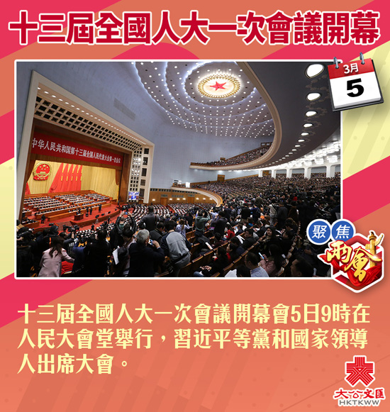 大公文匯全媒體報道:十三屆全國人大一次會議開幕會5日9時在人民大會堂舉行,習近平等黨和國家領導人出席大會。今日大會議程包括聽取和審議政府工作報告、審查計劃報告和預算報告、聽取全國人大常委會關於憲法修正案草案的說明等。