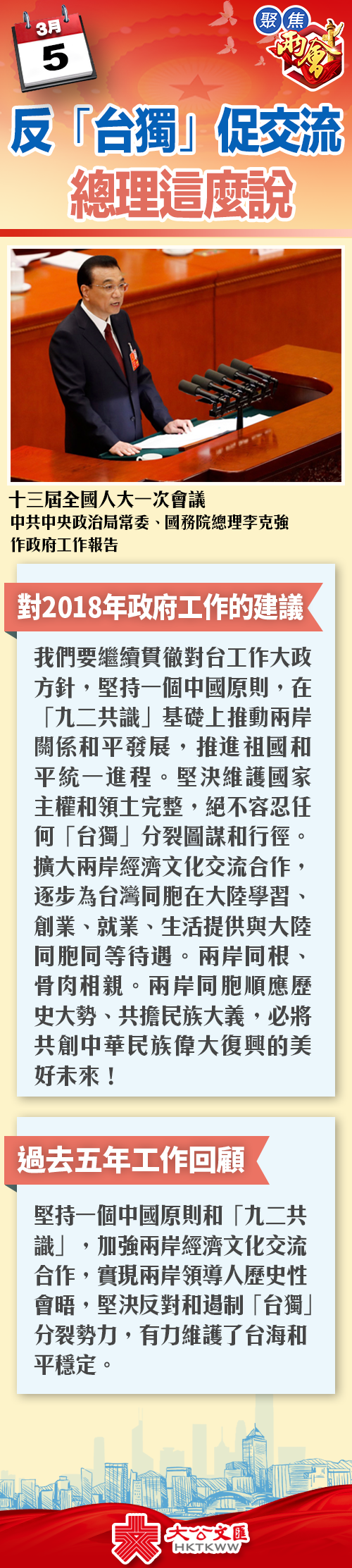 大公文匯全媒體報道:十三屆全國人大一次會議5日上午在北京人民大會堂開幕,中共中央政治局常委、國務院總理李克強作政府工作報告。報告中對台工作內容共236字,包括過去5年工作回顧,及對2018年政府工作的建議。